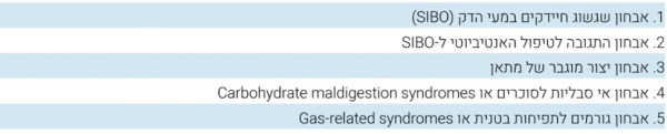 [[קובץ:טבלה 1. מצבים הקשורים להתפתחות שגשוג יתר של חיידקים במעי הדק (SIBO).png|מרכז|ממוזער|551x551 פיקסלים|'''טבלה 1. מצבים הקשורים להתפתחות שגשוג יתר של חיידקים במעי הדק (SIBO)''']] | [[קובץ:טבלה 1. מצבים הקשורים להתפתחות שגשוג יתר של חיידקים במעי הדק (SIBO).png|מרכז|ממוזער|551x551 פיקסלים|'''טבלה 1. מצבים הקשורים להתפתחות שגשוג יתר של חיידקים במעי הדק (SIBO)''']] | ||