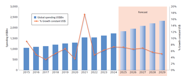 תרשים 1. ההוצאה הגלובלית על תרופות משנת 2015 ועד הצפי בשנת 2029. מקור: דו"ח The Global Use of Medicines Outlook through 2029" ,IQVIA".