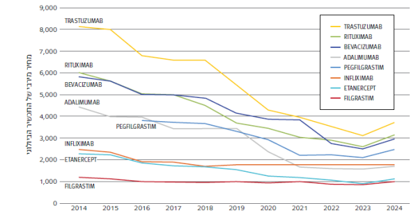 גם Bevacizumab (AVASTIN) הראה ירידה משמעותית מ־5,831 שקל בשנת 2014 ל-2,950 שקל בשנת 2024, ירידה של כ־49%. ירידות משמעותיות נרשמו גם ב-Trastuzumab (Herceptin) שנחתך מ־8,127 שקל ב־2014 לכ־3,731 שקל בשנת 2024, ירידה של כ־54%.