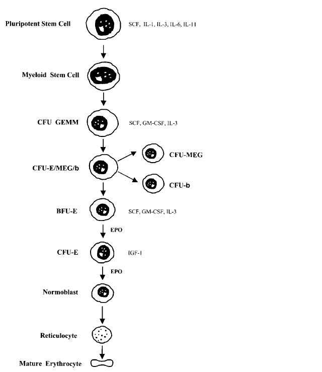 כמו בתרשים שמתואר בתרשים למטה, פעילותו של EPO באה לביטוי בשני שלבים מתקדמים יחסית במהלך המסלול מ-pluripotent stem cell עד ליצירת האריתרוציט הבשל, דהינו אריתרופויאטין מתחיל לפעול בשני השלבים המתחילים המתחילים ב-BFU-E או burst-forming unit erythroid עד ליצירת הנורמובלסט, שהיא צורת התא המקדימה את הרטיקולוציט המוביל לאריתרוציט הבוגר.