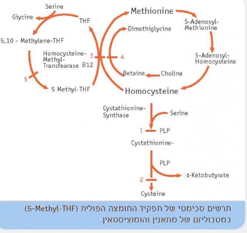 מבחינה כימית, methyltetrahydrofolate-5 מוסרת קבוצת מתיל אחת להומוציסטאין, והופכת אותו ל-L-methionine. ויטמין B12 נחוץ בתור קופקטור לפעולה זו. L-methionine מהווה בסיס לייצור חלבונים, טימידילט, מרכיבי דנ"א, רנ"א, פוספוליפידים, אפינפרין, מלטונין, קראטינין ומולקולות חשובות נוספות.