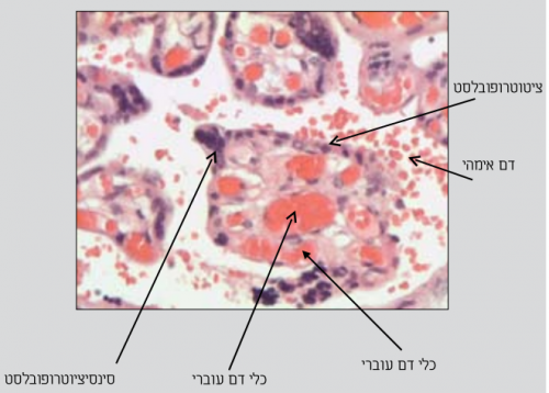 השליה ההומאנית מקורה מתאי הטרופקטודרם (Trophectoderm) של הבלסטוציסט (Blastocyst) המשתרש ברירית הרחם. במהלך התמיינות השליה נוצרים סיסי השליה (Chorionic villi) כאשר בתחילה אלה הם סיסים ראשוניים (Primary villi) העשויים מתאי ציטוטרופובלסט (Cytotrophoblast) וסינסיטוטרופובלסט (Syncytiotrophoblast) בלבד. בהמשך, הסיסים יתפתחו לסיסים שניוניים ועם הופעת כלי דם עובריים יהפכו לסיסים שלישוניים (Tertiary villi). הממברנה המפרידה בין הדם האימהי לכלי הדם העובריים (כלומר, למדור העוברי) כוללת את האנדותל של הקפילרה העוברית ואת הטרופובלסט, הכולל סטרומה של הווילוס, ציטוטרופובלסט וסינסיציוטרופובלסט (תמונה מספר 1). שכבת הסינסיציוטרופובלסט נוצרת מאיחוי של שכבת תאי ציטוטרופובלסט (תאי לנגרהאנס) החד גרעיניים, המונחות מתחת לסינסיציום. תאי הציטוטרופובלסט "מתחברים" זה לזה ולסינסיציוטרופובלסט על ידי דסמוזומים (Desmosome). צידה האפיקלי של הממברנה, בשכבת הסינסיציוטרופובלסט, הוא פולרי בעל מבנה של מיקרויליי (Microvilli) המגדילים באופן משמעותי את שטח הפנים (Brush-border); זהו הצד הפונה ישירות אל הדם האימהי, ואילו הממברנה הבזלית (Basal membrane) פונה לצד העוברי. בתחילת ההיריון, עוביה של הממברנה הוא כ-50–100 מיקרומטר ובעקבות שינויים היסטולוגיים הכוללים ירידה בעובי ה-Syncytium, הפחתה יחסית במספר תאי ציטוטרופובלסט וירידה ברקמת חיבור, עוביה פוחת עד ל-5-4 מיקרומטר בסוף ההיריון. במקביל, קיימת במהלך ההיריון עלייה במספר קפילרות הדם וקרבתן אל פני השטח, מבנה המאפשר בסיסים הטרמינלים מגע קרוב בין הדם האימהי לדם העוברי והעלאת יעילות הדיפוזיה ושחלוף החומרים בין האם והעובר[1].