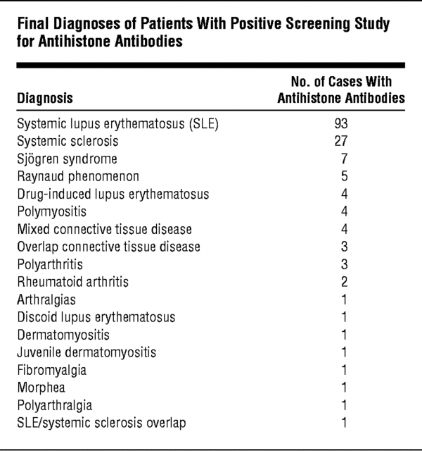תשעים וששה אחוזים מבין הנבדקים עם lupus המושרה על ידי procainamide, יימצאו חיוביים בבדיקת נוגדנים עצמיים להיסטון, ו-100% מבין אלה עם lupus מושרה על ידי פניצילאמין, methyldopa או isoniazid, יתקבלו חיוביים בבדיקת נוגדנים עצמיים להיסטון. ב-70% מהמטופלים עם rheumatoid arthritis, עם תסמונת Felty, עם תסמונת Sjogren, עם סקלרוזיס סיסטמית, או עם צמקת מרתית ראשונית נמצא נוגדני אנטי-היסטון, וכן במספר מחלות נוירולוגיות.