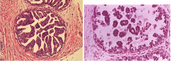 - ה- Comedo type, המתאפיינת ברקמה נמקית סמיכה במרכז הצינורית, לעתים עם הסתיידויות בתוכו (תמונה 55.12).