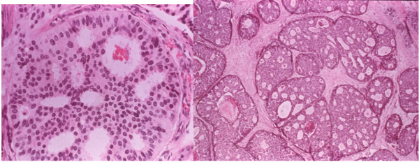 - ה- Cribriform type, שבה השאת ממלאת את הצינורית בצורת מצבורי תאים וחללים ביניהם (תמונה 58.12).