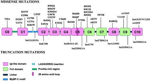 מוטציות missense בחלבון MyBP-C אנושי, הידועות ככאלה הגורמות ל-HCM ומבחר של מוטציות truncation. Ins מצביע על insertion של חומצת אמינו ונוקלאוטיד; del מצביע על שמט ((deletion של נוקלאוטיד. מוטציות splice site מתוארות במושגים של מספר ה-intron (Int), מלווה על ידי אתר ה-donor (DS) או על ידי אתר ה-acceptor (AS), והשינוי בנוקלאוטיד בנוסף למיקומו על רצף הקונצנזוס.
