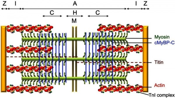 תיאור סכמטי של הסרקומר המראה את המיקום הספציפי של cMyBP-C. היחידה התפקודית הבסיסית של שריר הלב היא הסרקומר, המורכב מחלבונים פילמנטיים דקים ועבים. החלבונים הפילמנטיים העבים הם titin, מיוזין ו-cMyBP-C, ואילו החלבונים הפילמנטיים הדקים הם אקטין, α-tropomyosin וקומפלקס טרופונין הכולל טרופונין T וטרופונין I. cMyBP-C יוצר 7-9 רצועות טרנסברסליות במרְוָחים סדירים של 43 ננומטר באזור C של הA-band הסרקומרי, ומהווה כ-2% מהמסה המיו-פיברילית.