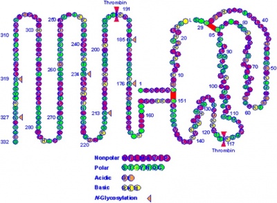 | − | עוד מאפיין של TPO שרצף חומצות האמינו 154 עד 332 מכיל 6 אתרי גליקוזילציה (N-linked), ורצף זה פחות משומר בין המינים השונים. ואמנם לרצף של 176 חומצות האמינו ה-C טרמינאליות אין הומולוגיה עם איזשהו חלבון ידוע. מחקרים על הקשר בין מבנה ופקוד פיזיולוגי הדגימו ש-153 חומצות האמינו הראשונות של TPO, הן היחידות הנדרשות להשפעתו התרומבו-פויאטית in vitro (על פי de Sauvage וחב' ב-Nature משנת 1994), שכן מקטע N-טרמינאלי זה הוא שנקשר לקולטן c-Mpl (עפ"י Kuter וחב' ב-Proc Natl Acad Sci USA משנת 1994). אך אם מבקעים את TPO בין חומצות אמינו Arg153 ו-Arg154, מסתבר שמחצית אורך החיים של הפפטיד המכיל את 153 חומצות האמינו בהזרקתו לציקולציה, קצר בהרבה מזמן מחצית החיים של 20-40 שעות של חלבון TPO השלם (Hokom וחב' ב-Blood משנת 1995 ו-Harker וחב' ב-Blood משנת 1996). סבורים שהמחצית השנייה המכילה 6 שרשרות סוכר מחומצת אמינו 154 ואילך בחלבון השלם, מקנה יציבות ומאריכה את תקופת מחצית החיים (עפ"י Vadhan-Raj ב-Semin Hematol משנת 1998). תופעה דומה מוכרת גם עם EPO. המבנה הגבישי של TPO נלמד והוא מגלה אגד המורכב מ-4 גדילים (helixes) אנטי-מקבילים דומים לאלה של EPO , שבקיפולם יוצרים 2 אתרי קישור שונים בעלי זיקות שונות לקולטן של TPO. אתר קישור אחד הוא בעל קבוע קישור של | + | עוד מאפיין של TPO שרצף חומצות האמינו 154 עד 332 מכיל 6 אתרי גליקוזילציה (N-linked), ורצף זה פחות משומר בין המינים השונים. ואמנם לרצף של 176 חומצות האמינו ה-C טרמינאליות אין הומולוגיה עם איזשהו חלבון ידוע. מחקרים על הקשר בין מבנה ופקוד פיזיולוגי הדגימו ש-153 חומצות האמינו הראשונות של TPO, הן היחידות הנדרשות להשפעתו התרומבו-פויאטית in vitro (על פי de Sauvage וחב' ב-Nature משנת 1994), שכן מקטע N-טרמינאלי זה הוא שנקשר לקולטן c-Mpl (עפ"י Kuter וחב' ב-Proc Natl Acad Sci USA משנת 1994). אך אם מבקעים את TPO בין חומצות אמינו Arg153 ו-Arg154, מסתבר שמחצית אורך החיים של הפפטיד המכיל את 153 חומצות האמינו בהזרקתו לציקולציה, קצר בהרבה מזמן מחצית החיים של 20-40 שעות של חלבון TPO השלם (Hokom וחב' ב-Blood משנת 1995 ו-Harker וחב' ב-Blood משנת 1996). סבורים שהמחצית השנייה המכילה 6 שרשרות סוכר מחומצת אמינו 154 ואילך בחלבון השלם, מקנה יציבות ומאריכה את תקופת מחצית החיים (עפ"י Vadhan-Raj ב-Semin Hematol משנת 1998). תופעה דומה מוכרת גם עם EPO. המבנה הגבישי של TPO נלמד והוא מגלה אגד המורכב מ-4 גדילים (helixes) אנטי-מקבילים דומים לאלה של EPO , שבקיפולם יוצרים 2 אתרי קישור שונים בעלי זיקות שונות לקולטן של TPO. אתר קישור אחד הוא בעל קבוע קישור של 3.3nM והשני בעל זיקה נמוכה יותר עם קבוע קישור של 1.1nM (על פי Feese וחב' ב-Proc Natl Acad Sci USA משנת 2004). |
