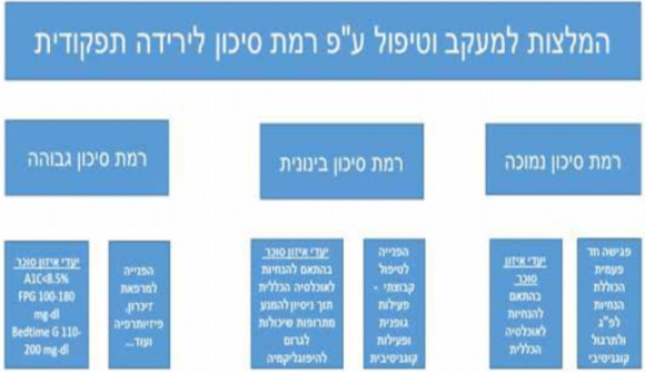 - המלצות טיפול לקבוצה ברמת סיכון נמוכה: מטופלים אשר ימצאו בטווח התקין יקבלו הנחיות הכוללות מרשם לאימון גופני, תרגילי שיווי משקל, תרגול קוגניטיבי והמלצות רפואיות בהתאם לממצאים על מנת לשמר את מצבם. יעדי איזון רמות הסוכר, לחץ הדם והליפידים יקבעו בהתאם להנחיות לאוכלוסיה הכללית[2]