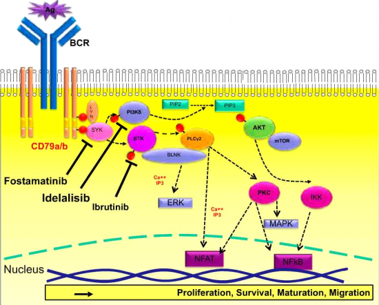 תרשים 1. הפעלה של קולטן תאי B Cell Receptor (BCR) B ומעבר אותות אל פקטורי שעתוק גורמים לפרוליפרציה, דיפרנציאציה, השרדות ונדידה של לימפוציטים. מולקולות קטנות שנקשרות ל-tyrosine kinases מעכבות את פעולת האנזימים PI3Kδ-1 SYK BTK באופן יעיל ובלתי הפיך