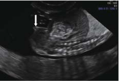 תמונה 2. עובר ממין נקבה בשבוע 14, החץ מראה כיוון genital tubercle כלפי מטה