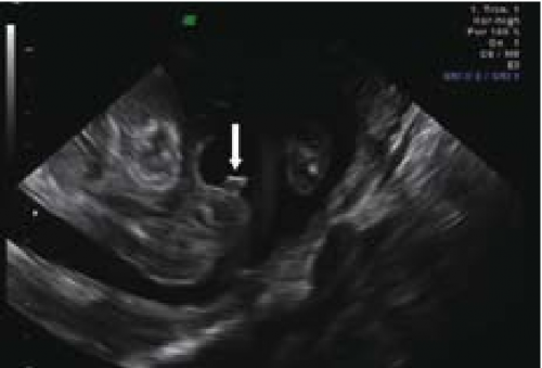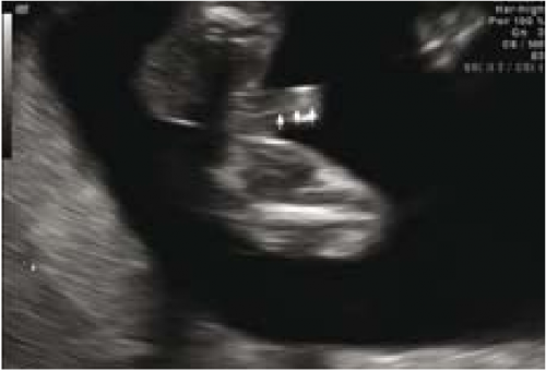 בעיות באבחון מין העובר בעוברים בריאים ללא מומים באיברי המין החיצוניים ועל ידי שימוש בכלי העזר שצוינו לעיל, ניתן להגיע לאבחנה נכונה של מין העובר לאחר שבוע 13 כמעט ב-100 אחוז מהמקרים. אך עוברים עם מומים באיברי המין החיצוניים מהווים אתגר אבחנתי קשה. רמזים לנוכחות מומים באיברי המין החיצוניים כוללים: אי יכולת להדגים את שלפוחית השתן33, אבחון מין העובר כנקבה בטרימסטר הראשון או השני המוקדם בהתבסס על ^sagittal sign ובשלב יותר מאוחר, הדגמת איברי מין זכריים34, פער בגודל הפאלוס יחסית לגיל ההיריון, עיקום או כיפוף של הפאלוס, יחסים אנטומיים לא תקינים בין שק האשכים לפלוס (phallus), העדר אשכים בשק בטרימסטר השלישי והעדר מבנה אנטומי תקין של השפתיים או שק האשכים35. יש לחשוד במומים באיברי המין החיצוניים במקרים בהם אין התאמה במין העובר הסונוגרפי לעומת המין כפי שנקבע לפי הקריוטייפ במי השפיר או סיסי שליה37,36. Hypospadias - לעתים הרמז היחיד לקיום היפוספאדיאס הוא הדגמת genital tubercle מכוון כלפי מטה, מה שמעיד על עובר ממין נקבה בשבועות 16-13 ובשלב יותר מאוחר הדגמת איברי מין של זכר38,34. הכיוון כלפי מטה של איבר המין הזכרי במקרים של היפוספאדיאס הוא כתוצאה מהיווצרות ״chordee״, שהוא בעצם אטרזיה של הגוף הספוגי (corpus spongiosum) דיסטלית להיפוספאדיאס. ממצאים סונוגרפיים אחרים שיכולים לרמוז על קיום היפוספאדיאס כוללים: מורפולוגיה לא תקינה של של החלק הדיסטלי של הפין, שני קווים אקוגיניים אורכיים שמייצגים שני הקפלים הלטרליים של שארית העורלה, כיפוף קדמי של הפין, זרם שתן שמקורו מהחלק הונטרלי של הפין39,30 m-״tulip sign" כפי שתואר על ידי מייזנר וחב׳40 שמייצג בעצם את הכיפוף הפנימי של הפין עם שק האשכים החצוי. אולטרסאונד תלת מימדי יכול להדגים את הכיפוף הפנימי של הפין והיחס שלו לשק האשכים (תמונה 9). אישור סופי לקיום ההיפוספאדיאס ומיקומו ניתן להשגה על ידי הדגמת מקור זרם השתן (תמונה 10) בהשוואה להשתנה תקינה (תמונה 11 ו-12).