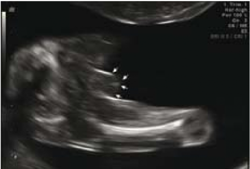 חשודים. בעבודה זו44 בליטה בבטן התחתונה נצפתה בשמונה מקרים, ופין קטן או משוך קדמית בשמונה מתוך 14 זכרים והרחבה של iliac crests בשלושה מקרים44. Cloacal extrrophy היא המקרה הקיצוני של ספקטרום זה ומייצגת בעצם אומפלוצלה עם שלפוחית שתן פתוחה כלפי חוץ יחד עם מומים של מערכת העיכול ואיברי המין33. נדירותו של מום זה (1 ל-200,000 עד 400,000 לידות) גורמת לקושי רב באבחון טרום לידתי אך יש לחשוד בו כאשר לא ניתן להדגים את השלפוחית בתוך הבטן בנוכחות חסר בדופן הבטן מתחת לטבור עם בקע טבורי או מבנים ציסטיים בדופן הבטן כאשר האחרון מייצג הישארות של ^46,45 cloacal membrane. למצב זה מתלווים בדרך כלל מומים של הגפיים התחתונות, מנינגומיאלוצה ומומי כליות46.
