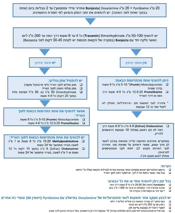 • שילוב של ויטמין B6 (פירידוקסין) עם דוקסילאמין (H1 receptor antagonist). שני המרכיבים קטגוריה A‏, 20 מיליגרם כל אחד, בטבליה המשלבת שחרור מיידי ומושהה (בונג׳סטה). לרוב כדור אחד ביום מספיק, ובמידת הצורך ניתן לקחת עד 2 טבליות ליום, אחת בבוקר ואחת לפני השינה. השימוש אינו מומלץ לנשים הנוטלות monoamine oxidase inhibitors