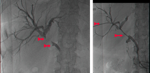 תצלום 53.8: תצלום שמאל: פגם המילוי בצינור המרה הנגרם ע"י שאת. תצלום ימין: תותב (stent) בצינור המרה שהוחדר דרך ERCP (חיצים) ומגשר בין חלקי צינור המרה.
