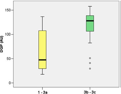 הטיטר של נוגדני IgG כנגד DGP נמצא כ-123.6 יחידות בממוצע, שהיה משמעותית גבוה יותר בתינוקות עם נזק חמור לרירית המעי (דרגה 3b ו-3C), בהשוואה לטיטר נוגדנים ממוצע של 47.4 יחידות בתינוקות עם נזק מתון יותר במעי (דרגה 1-3a), כפי שמופיע בתרשים: