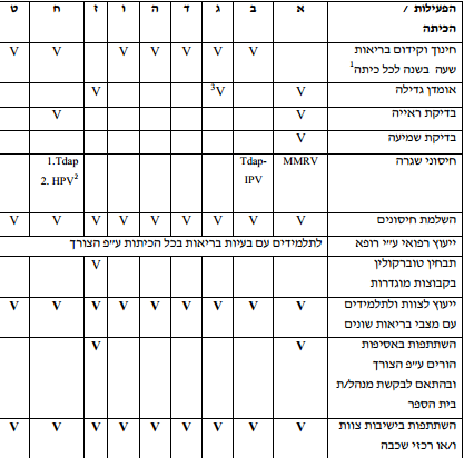 10.3 חיסונים 10.3.1 חיסוני שגרה - בכיתות הייעודיות, על פי תדריך החיסונים המתעדכן מעת לעת של משרד הבריאות. 10.3.2 השלמת חיסונים - מתן חיסונים לתלמידים שלא קיבלו את שגרת החיסונים המלאה של גיל הילדות, על פי תוכנית החיסונים בישראל . ההשלמה תעשה לתלמידים בכל הכיתות, ע"פ גיל הילד.