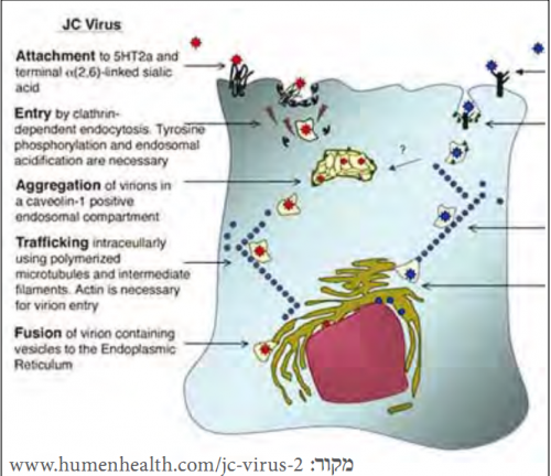 נגיף JC קרוי על שמו של מטופל בשם John Cunningham שאובחן עם PML. הנגיף שייך למשפחת DNA polyomavirus. לנגיף 3 חלבוני קפסיד היוצרים 8 פנוטיפים שונים כאשר פנוטיפ מס' 2 נמצא בנוזל השדרה או ברקמת המוח בחולה עם PML (תמונה 2). בני האדם הם מאחסנים בלעדיים של הנגיף והוא מצוי בצורתו הלטנטית ב-75 אחוז מהאוכלוסייה הכללית עקב זיהום ראשוני ע"י שאיפת הנגיף למערכת הנשימה. הנגיף נקשר לרצפטורים(2,6) sialic acid α ול-HT2a-5 המצויים על פני תאים ברקמה הלימפואידית (שקדים), מח עצם ותאי פלזמה, אפיתל כליה, אוליגודנדרוציטים ואסטרוציטים המשמשים לו כרזרבואר בצורתו הלטנטית (תמונה 3). לכן, נוכחות PCR חיובי ל-JCV בבדיקות בשתן (עד 25 אחוז מהאוכלוסיה הכללית) אינה מהווה עדות למחלה פעילה.