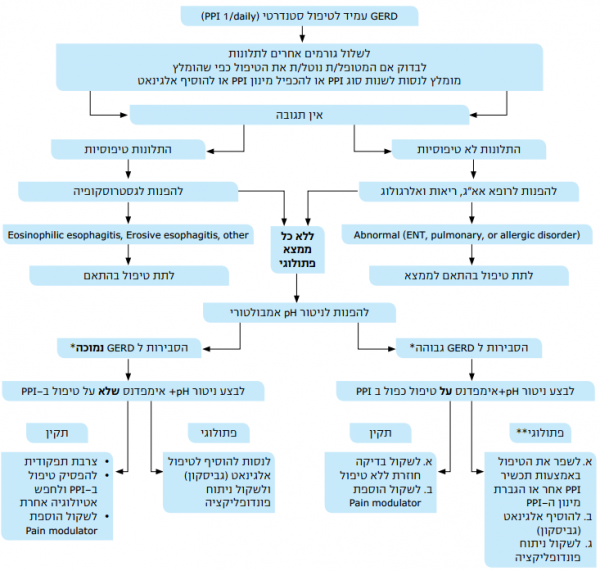 - מטופלים שלא מגיבים לטיפול ב-PPI למרות האמור לעיל, יש להפנות להמשך בירור וטיפול על ידי גסטרואנטרולוג. (חוזק ההמלצה - בינוני, חוזק העדות מהספרות - בינוני)