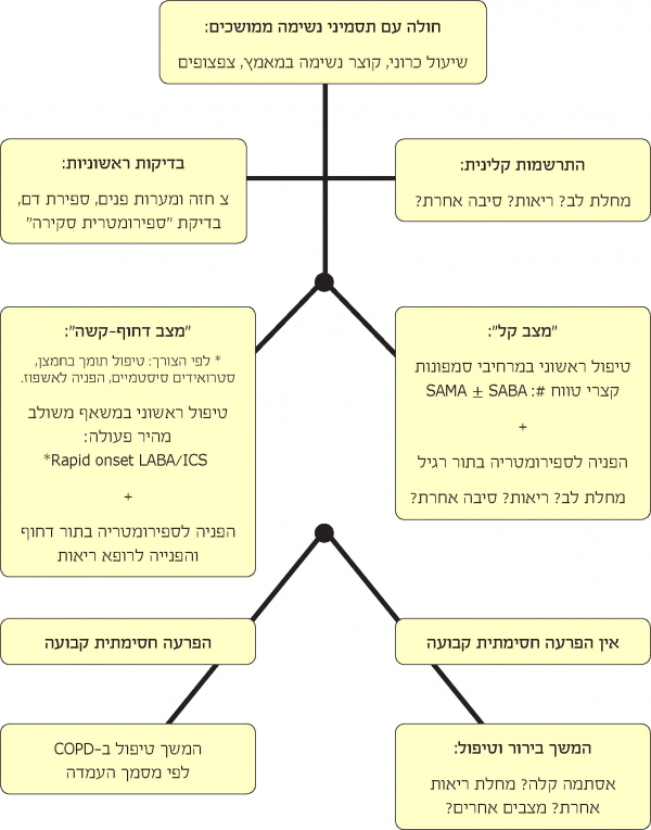 - לעומת זאת, בחולה עם קוצר נשימה ללא רכיב התקפי: טיפול במרחיב סמפונות קצר טווח במקביל לבירור הכולל הפנייה דחופה לביצוע ספירומטריה אבחנתית וייעוץ רופא ריאות