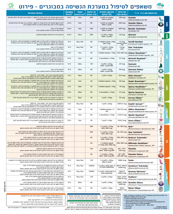 - ↑ מקרא לקיצורי־שם קבוצות הטיפול בטבלה: מרחיבי סמפונות קצרי טווח - SABA (ביתא אגונסטים, דוגמה: ונטולין), SAMA (אנטי מוסקרינים: אטרובנט). מרחיבי סמפונות ארוכי טווח - LABA (ביתא אגונסיטים לטווח 12 שעות, או - 24 שעות); LAMA-(אנטי מוסקריניים, לטווח 12 שעות, או - 24 שעות); ICS - סטרואידים בהשאפה.
