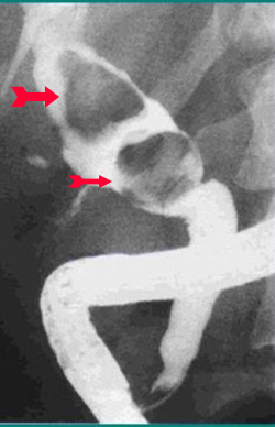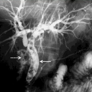 | תצלום 30.8: הדגמת אבנים בדרכי המרה ב- ERCP (חיצים מצביעים על אבנים בדרכי המרה, חץ מקווקו על אבנים בכיס המרה). | |