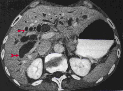 ב- CT המבוצע לחולים אלה במסגרת בירור כאבי בטן אפשר לראות הרחבה של דרכי המרה (תצלום 33.8) וכן אבנים בדרכי המרה (תצלום 34.8 ) למרות שאין זו בדיקת הבחירה לאבנים בדרכי המרה.
