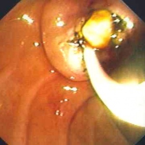 | תמונה 3.8: הוצאת אבנים דרך הפפילה על-שם ואטר ב-ERCP. | |