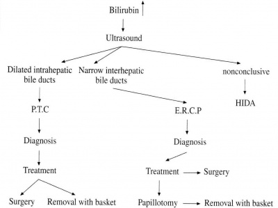 אם דרכי המרה התוך-כבדיות מורחבות, אפשר לבצע PTC או ERCP, כדי להדגים את העץ הביליארי. אם הן אינן מורחבות, מומלץ לבצע ERCP. בשתי בדיקות אלה אפשר להדגים תהליכים חסימתיים בצורה מהימנה ביותר. טכניקות אלה מאפשרות לטפל בחולים לאחר האבחנה.