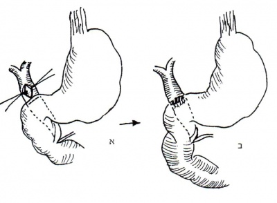 - כולדוכודואודנוסטומיה (Choledochoduodenostomy) – השקה המתבצעת בין מרכז הכולדוכוס לבין חלקו השני של התריסריון. השקה זו, על רוחבה להיות כ- 2 ס"מ, כדי לאפשר ניקוז מרתי תקין (איור 15.8א'). אחד הסיבוכים של הכולדוכודואודנוסטומיה הוא תסמונת Stump המתבטאת בכולאנגיטיס, העולה מקטע הכולדוכוס שאינו מנוקז.
