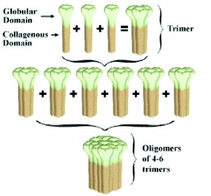 מונומרים של ADN בפלזמה נוטים להתגבב לצברים של מבנים מורכבים יותר, כאשר בשלב הראשון נוצר homo-trimer שהוא המבנה הבסיסי, המתקבל על ידי התחברות של 3 מונומרים (משקל מולקולארי 30,000 דלטון) באזור המקטע הגלובולארי שלהם. מונומרים של ADN מוצאים רק בתוך האדיפוציטים אך לא בפלזמה. נמצא שהמקטע (domain) הקולאגני של ADN חיוני ליצירת הצברים הגבה-מולקולאריים של 6-12 מונומרים של ADN, אך אינו חיוני ליצירת המבנים הטרימריים. כמו ריכוזי ADN בפלזמה, הריכוזים היחסיים של צברים גבה-מולקולריים מראים דימורפיות מגדרית, כאשר בנשים מוצאים צברי ADN גבוהים יותר מאשר בגברים.