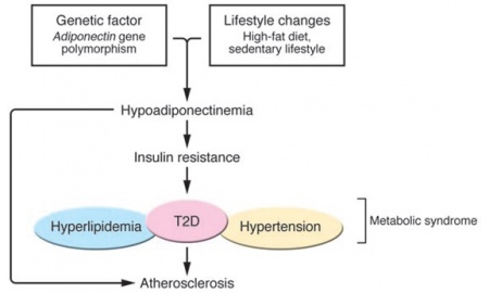 סוכרת type 2 נובעת משילוב של גורמים גנטיים וסביבתיים. בסריקה של רצפי גנום ממדגם גדול של בני-אדם, מיפה את האתר הקשורים לסוכרת type 2, לתסמונת מטבולית ולמחלת לב כלילית לכרומוזום q273 בו ממוקם גם הגן המקודד ל-ADN. מחקריו של Hara וחב', הראו שהשינויים הגנטיים הגורמים לרמה נמוכה של ADN, כרוכים בהגדלת הסיכון לסוכרת type 2 באוכלוסיה ביפאן, ואילו מחקר נוסף ביפאן הראה שפרטים הנושאים מוטציית missense בגן ל-ADN הגורמת להיפו-אדיפונקטינמיה, היו בעלי פנוטיפ של תסמונת מטבולית, כולל תנגודת לאינסולין, ומחלת לב כלילית. פולימורפיזם גנטי זה של הגן ל-ADN, הכרוך ברמות מופחתות של הורמון זה, יכול להיות אחראי לפחות באופן חלקי לפתוגנזה של עמידות לאינסולין, כמו גם לסוכרת.