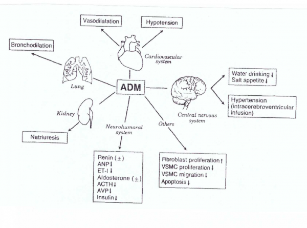 - AVP או arginine vasopressin: ההשפעה של החדרת ADM על הפרשה של AVP, נחקרה בחולדות (Kohno וחב' ב-Hypertension משנת 1995). הזרקה מוחית אינטרה-ונטריקולרית של ADM, החלישה באופן חלקי אם כי משמעותי הגברת רמות AVP המושרה על ידי היפר-אוסמולליות ועל ידי hypovolemia. עם זאת, עירוי תוך-ורידי של ADM לא גרם לשינוי ברמות AVP בפלזמה