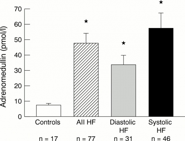 מחקר pilot במטופלים עם אי-ספיקת לב חריפה, טיפול משולב עם ADM ו-ANP, הביא לשיפור המודינאמי, כולל הפחתה בלחץ עורקי ריאתי, הגברת הפרשת שתן, וירידה ברמות אלדוסטרון ו-BNP בפלזמה (Nishikimi וחב' ב-Circ J משנת 2009). בניגוד לנתונים מוקדמים יותר, ADM כונה "cardiac depressant factor" כיוון שהזרקה של אנטגוניסט של הקולטן של ADM, הביאה להגברת כושר הכיווץ של מיוציטים קרדיאליים, בשלב המוקדם של אנדוטוקסמיה של חולדות (Hyvelin וחב' ב-J Card Surg משנת 2002, ו-Mittra וחב' ב-Am J physiol Heart Circ Physiol משנת 2004).