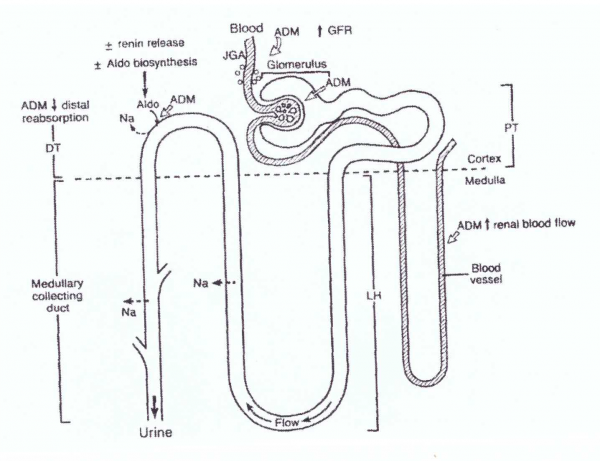 Miura וחב' גם כן דיווחו על כך שפעילויות הרחבת כלי הדם והנתריאורטיות של ADM בכליות, נחלשו על ידי טיפול קודם עם (NG-nitro L-arginine (l-NOARG, והן התהפכו חלקית על ידי L-arginine (Miura וחב' ב-Br J Pharmacol משנת 1995). דיווח נוסף הראה ש-ADM הגביר את הפרשת NO אנדוגני בכליות מבודדות (Hirata וחב' ב-Hypertension משנת 1995). Blakely וחב' דיווחו ב- Am J Physiol משנת 1997, ש-ADM הגביר בכליות את צפיפות הקולטנים של תיאזיד באופן מתון ללא כל השפעה על הפרשת סידן בשתן.