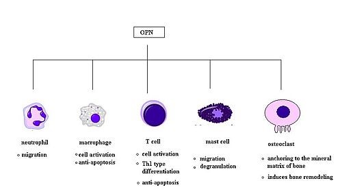 תפקידים חיסוניים ידועים של OPN: חלבון זה נקשר למספר קולטנים של integrin כולל α4β1, α9β1 ו-α9β4 המבוטאים על ידי ליקוציטים והמשרים ספיחה בינתאית, נדידת תאים, והישרדות של תאי חיסון כולל ניטרופילים, מקרופאגים, תאי T, תאי פיטום ואוסטאוקלסטים.