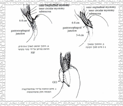 איור 10.1 : הניתוח על שם Heller א.החתך בוושט ב. הרחבתו לקיבה ג. פונדופליקציה