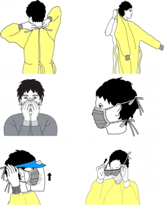 - "ציוד מיגון אישי" - (Personal protective equipment) ביגוד או ציוד מיוחד הנלבשים על ידי מטפל שמטרתם הגנה בפני מחוללי זיהום. כוללים: חלוקים, כובעים, כפפות, משקפי מגן, משקף פנים, מסיכות