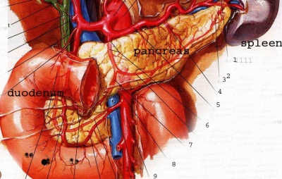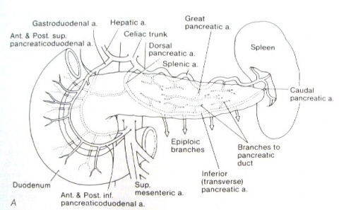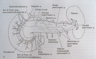 מקרא: 1. Left gastro-epiploic a. 2. Caudal pancreatic a. 3. Great pancreatic a. 4. Splenic a. 5. Superior pancreatic a. 6. Inferior pancreatic a. 7. Anastomotic aerteries 8. Middle colic a. 9. Superior mesenteric a. 10. Inferior pancreatico-duodenal a. 14. Superior pancreatico-doudenal a.