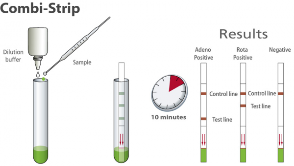 ערכת הבדיקה לזיהוי אנטיגן נגיף Rota בדגימת צואה נועדה לזיהוי ישיר ואיכותי של נוכחות הנגיף. דגימות הצואה חייבות להילקח מיד לאחר הופעת תסמינים. מספר חלקיקי הנגיף קטן כבר לאחר שבוע משיא התסמינים, וזיהוי הנגיף עלול להיות קשה יותר. דגימת הצואה צריכה להיות מאוחסנת בקירור ל-1–2 ימים. אם התנאים מחייבים אחסון ממושך יותר הצואה חייבת להישמר בהקפאה. במקרה זה, הדגימה חייבת להיות מופשרת באופן מלא, להיות מועברת לטמפרטורת החדר ולעבור הומוגניזציה לפני הבדיקה. כאשר הצואה קשה יש לסגור היטב את המבחנה המכילה צואה לאחר הוספת תמיסת מיצוי, ולנער את המבחנה בעוצמה כדי להביא את פיסות הצואה הנוקשה למצב נוזלי יותר. יש להחדיר את רצועת המדידה (test strip) לתמיסת הצואה בטמפרטורת החדר למשך 10 דקות. הופעה של פס בודד של ביקורת על רצועת המדידה מעידה על ביצוע נכון של הבדיקה. פס הביקורת ממוקם במחצית העליונה של רצועת המדידה. אם אין הופעת פס צבוע במיקום המיועד לביקורת, נראה שהבדיקה אינה בַּרת-תֹּקֶף.