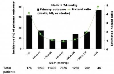 כבר ב־2006 מצאו מסרלי וחב' בניתוח פוסט־הוק של מחקר ה-INVEST (International Verapamil SR/Trandolapril Study), עליה פרוגרסיבית בסיכון לתמותה מכל סיבה שהיא ואירועי אוטם שריר הלב אך לא לאירועים מוחיים בהורדה מופרזת של ערכי לחץ דם דיאסטולי (איור מספר 2). העלייה בשיעור אוטם שריר הלב הוסברה על ידי תלות הזילוח לעורקים הכליליים בלחץ דם דיאסטולי[11].