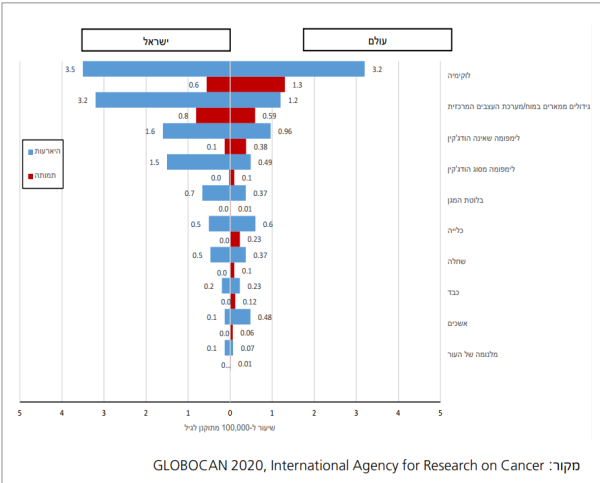 על פי נתוני Globocan של הסוכנות הבינלאומית לחקר הסרטן (IARC - International Agency for Research on Cancer) שבארגון הבריאות העולמי, צפי ההיארעות בישראל בשנת 2020 של רוב סוגי הסרטן שנבדקו בבני 19-0 בדרך כלל גבוה מההיארעות הצפויה בעולם, למעט סרטן הכליה, סרטן הכבד וסרטן האשכים. לעומת זאת, כאשר בוחנים את שיעור התמותה הצפוי בישראל ב-2020, נמצא כי למרות היארעות גבוהה יותר, שיעור התמותה בישראל נמוך מהצפי העולמי באופן עקבי (למעט עבור גידולי המוח ומערכת העצבים), מה שמצביע על הישרדות גבוהה (תרשים מספר 9).