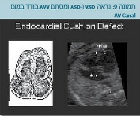 - קיום של מומים בלב מעלה את הסיכוי לבעיות כרומוזומליות, ויש מקרים שהדבר הוא בעל משמעות רבה, למשל: מציאה של מום מסוג תעלה עלייתית-חדרית שלמה (Complete atrioventricular canal) מעלה בצורה משמעותית מאוד את הסיכוי לקיום תסמונת דאון בעובר (תמונה 9).