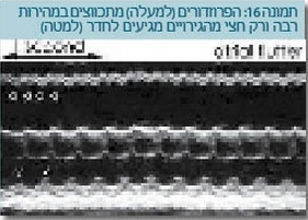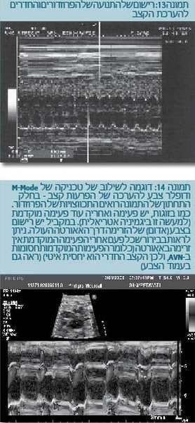 הפרעות קצב בעובר הן תחום שנחלו בו הצלחות די יפות באבחון ובטיפול, למרות הקושי ברישום הפעילות החשמלית של הלב העוברי. האבחון נעשה ברובו על ידי רישום התנועה באולטרה-סאונד במצב תנועה (Motion mode ultrasound - M-mode ultrasound) של הפרוזדורים והחדרים, ורישום של הזרימה על ידי דופלר ודופלר צבע. כלומר, אנו מנסים להבין מהפעילות המכנית של הלב את מה שקורה חשמלית (תמונה 13).