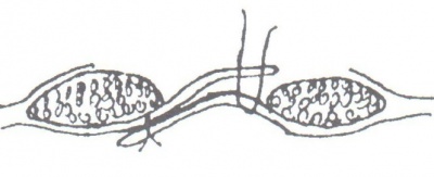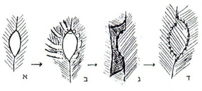 כאשר הבקע הוא גדול מאוד ולא ניתן לקרב את שולי הפסציה ללא מתח יש לשחרר את הפסציה מעל שריר הבטן הישר (רקטוס, Rectus abdominis) על-ידי חתך אורכי מעל שני הרקטוסים, לקלף את הפסציה הפנימית מעל הרקטוס ולסובבה פנימה, כך שתכסה על הפגם בדופן הבטן. את העלה האחד תופרים לשולי הפסציה של הפגם מהצד השני ואת העלה הנותר מסובבים גם פנימה מעל פני העלה הקודם, כך שמתקבלת סגירה בשתי שכבות (איור 26.13).