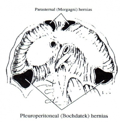בקע זה נחשב לפגם מולד, אולם הוא מופיע בעיקר במבוגרים. הבקע הזה מופיע מאחורי עצם החזה (סטרנום) משני צדדיו. בקעים אלה מתגלים בדרך כלל באורח מקרי בצילומי חזה, כגושים במדיאסטינום האמצעי התחתון. בטומוגרפיה ממוחשבת ניתן לראות את אברי הבטן מאחורי הלב ובצדדיו (תצלום 3.13).