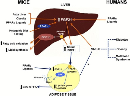 עכברים החסרים FGF21 נכשלים בהשרייה של ביטוי PGC-1α בתגובה לצום ממושך, ולוקים ב-gluconeogenesis וב-ketogenesis {כ}}(Potthoff וחב' ב-Proc Natl Acad Sci USA משנת 2009). GFG21 מעודד פוספורילציה של FGF receptor substrate 2 ושל ERK1/2 בכבד. טיפול עם FGF21 השרה בכבד ביטוי של רגולטורים של גלוקונאוגנזה, של מטבוליזם שומנים ושל קטוגנזה, כולל glucose-6-phosphate, phosphoenol pyruvate carboxykinase, 3-hydroxybutyrate dehydrogenase type 1 ו-.carnitine palmitoyltransferase 1α בנוסף, הזרקה של FGF21 נכרכה עם ירידה ברמת אינסולין בצירקולציה וברמות של חומצות שומן חופשיות. הטיפול עם FGF21 השרה ביטוי של mRNA ושל החלבון PGC-1α, אך בעכברים הביטוי של PGC-1α לא היה נחוץ להשפעה של FGF21 על המטבוליזם של גלוקוזה (Fisher וחב' ב-Endocrinology משנת 2011).