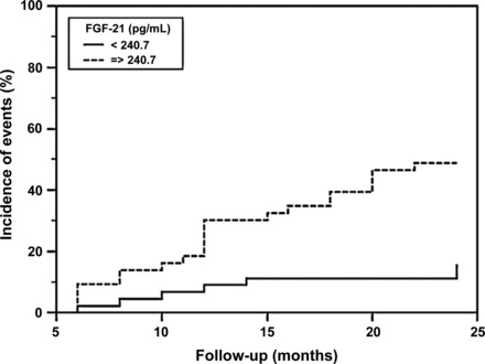 בבסיס המחקר, רמות FGF-21 בפלזמה גדלו בהדרגה עם ההחמרה של הדיס-גליקמיה מאלה עם סובלנות תקינה לגלוקוזה, דרך אלה המוגדרים כקדם-סוכרתיים, עד אלה עם סוכרת (0.0012p<). מתוך 1,292 משתתפי המחקר שלא היו סוכרתיים בבסיסו, רמה גבוהה של FGF-21 נמצאה מנבא פרוגנוסטי חזק להתפתחות סוכרת בהמשך (HR=1.792, עם 0.01p<), ביחד עם נתונים של היקף מותניים ושל רמות גלוקוזה בצום בפלזמה. רמות FGF-21 בפלזמה היו גבוהות יותר בקדם סוכרתיים לעומת בריאים לחלוטין (197.1 פיקוגרם/מ"ל לעומת 133.2 פיקוגרם/מ"ל (0.001p<), ואילו רמות FGF-21 בסוכרתיים לעומת קדם-סוכרתיים היו 234.0 לעומת 197.1 פיקוגרם/מ"ל (p<0.012).
