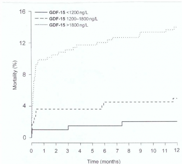 תוצאות מחקר של Kempf וחב' ב-Eur Heart J משנת 2007 היו כדלקמן: רמות GDF-15 בנסיוב נמדדו בשיטה אימונו-טורבידומטרית ב-741 מטופלים עם STEMI. בערך ב-72.2% מתוכם נמצאו רמות הגבוהות מ-1,200 ננוגרם/ליטר. רמות גבוהות של GDF-15 היו כרוכות בסיכון מוגבר של תמותה בהלך מעקב של שנה אחת. שיעורי התמותה מקץ שנה היו 2.1%, 5.0% ו-14.0% במטופלים עם רמות GDF-15 הנמוכות מ-1,200, או כאלה בין 1,200-1,800 או באלה עם רמות גבוהות מ-1,800 ננוגרם/ליטר, בהתאמה (p<0.001).‏ GDF-15 נותר מנבא בלתי תלוי של תמותה לאחר התאמה עם משתנים קליניים כטרופונין T, או כ-N terminal pro-B-type natriuretic peptide.