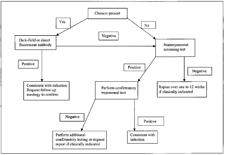 - מבחן הידוע כ-Treponemal test שהוא מבחן המזהה נוגדנים כנגד אנטיגנים של החיידק טריפונמה, ונחשב מבדק מאשר